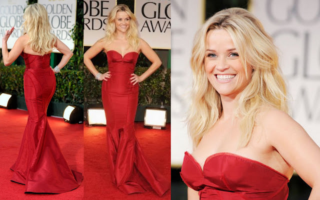 Hmm, jag vet inte vad jag tycker om Reese Witherspoons klänningsval, men hon ser ju så glad ut, så då blir det snyggt! Men klänningen ser inte ut att vara sådär jätteenkel att gå i!